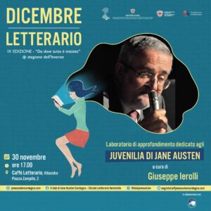 I primi due eventi si terranno sabato 30 novembre presso il Caffè Letterario di Villacidro e saranno dedicati rispettivamente, alle ore 17.00, al laboratorio di approfondimento degli scritti giovanili di Jane Austen, gli Juvenilia, a cura del saggista, studioso e traduttore Giuseppe Ierolli. Un’occasione unica per esplorare con approfondimenti e letture guidate le prime opere dell’amatissima autrice inglese, in compagnia di uno dei più grandi esperti italiani di Austen, per scoprire il talento precoce e l’ironia che contraddistinguono la penna della scrittrice.