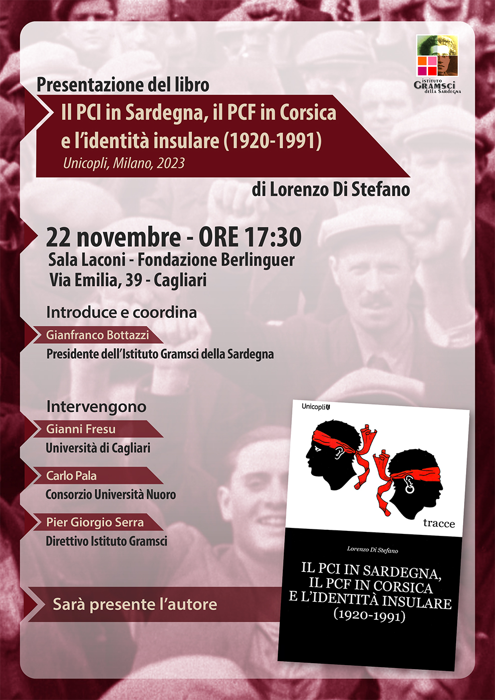 Venerdì 22 novembre, dalle ore 17.30, presso la Sala Laconi della Fondazione Berlinguer in via Emilia n. 39, si terrà la presentazione del libro “Il PCI in Sardegna, il PCF in Corsica e l’identità insulare (1920-1991)” di Lorenzo Di Stefano, edito da Unicopli nel 2023.