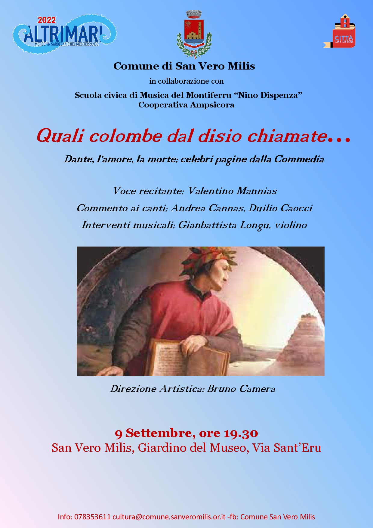 E’ in programma venerdì 9 settembre, alle ore 19.30, presso il Giardino del Museo di San Vero Milis “Quali colombe dal disio chiamate… Dante, l’amore, la morte: celebri pagine dalla Commedia”, recital con accompagnamento musicale.
