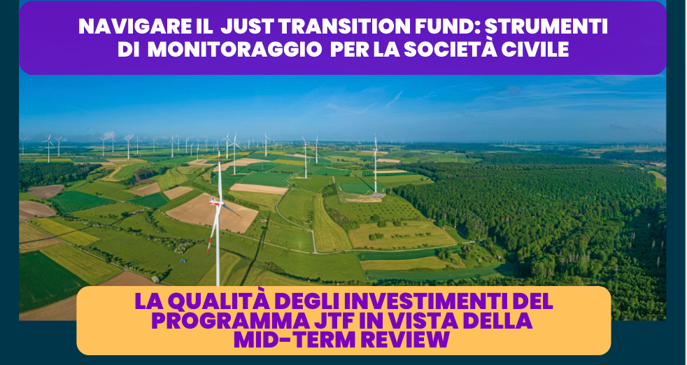Mercoledì 6 novembre appuntamento con il terzo webinar “La qualità degli investimento del programma JTF in vista della mid-term review” organizzato nel ciclo di incontri “Navigare il Just Transition Fund: strumenti di monitoraggio per la società civile”.