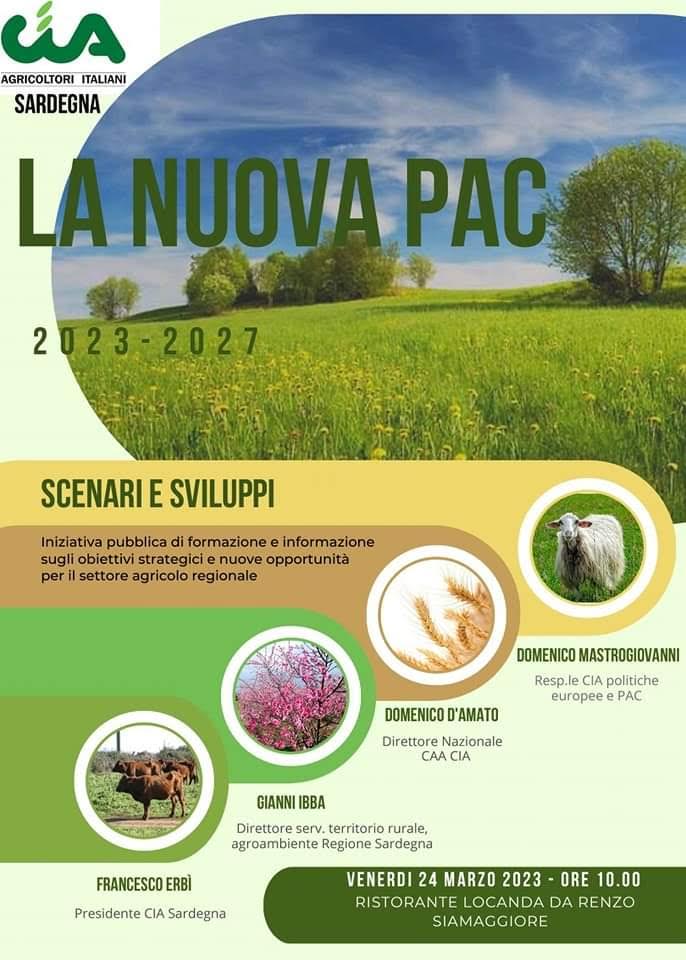 La riforma Pac 2023-2027 e il Complemento regionale per lo sviluppo rurale saranno illustrati, analizzati e discussi in un incontro aperto al pubblico, organizzato dalla Cia Sardegna, che si terrà venerdì 24 marzo, alle ore 10.00, nella sala convegni del ristorante locanda “Da Renzo”, al km 99 della strada statale 131, nel comune di Siamaggiore.