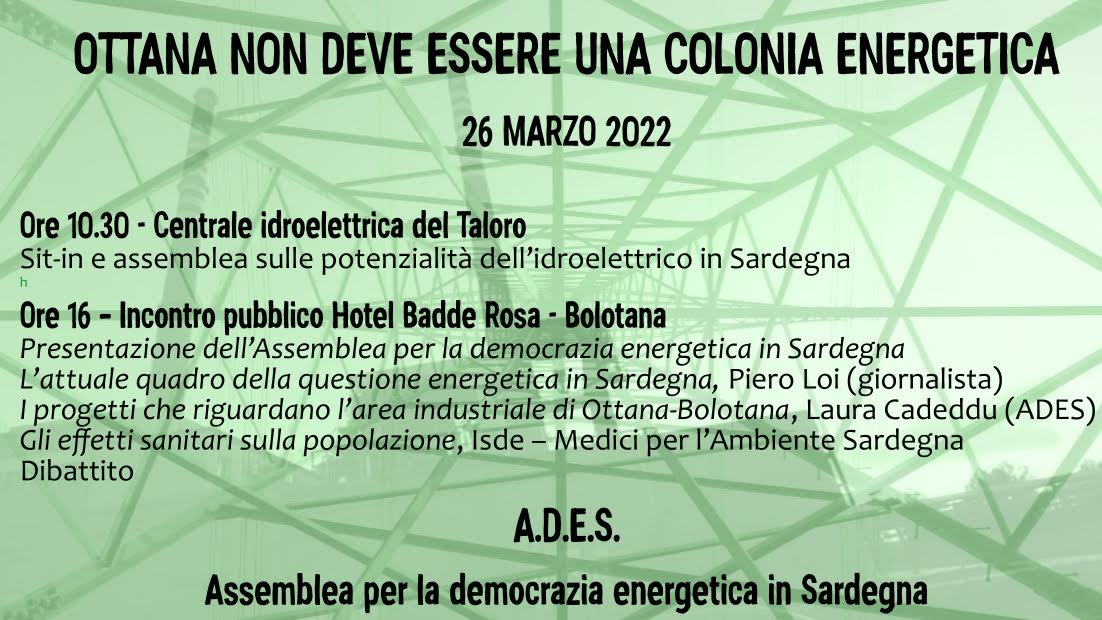 L’Assemblea per la Democrazia Energetica in Sardegna (A.D.E.S) organizza per sabato 26 marzo, alle ore 16.00, presso l’Hotel Badde Rosa di Bolotana, l’incontro pubblico “Ottana non deve essere una colonia energetica” sul futuro energetico della Sardegna e in particolare della piana di Ottana.