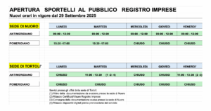 Dal 29 settembre 2025 la Camera di Commercio di Nuoro adotterà nuovi orari di apertura al pubblico dei propri sportelli.