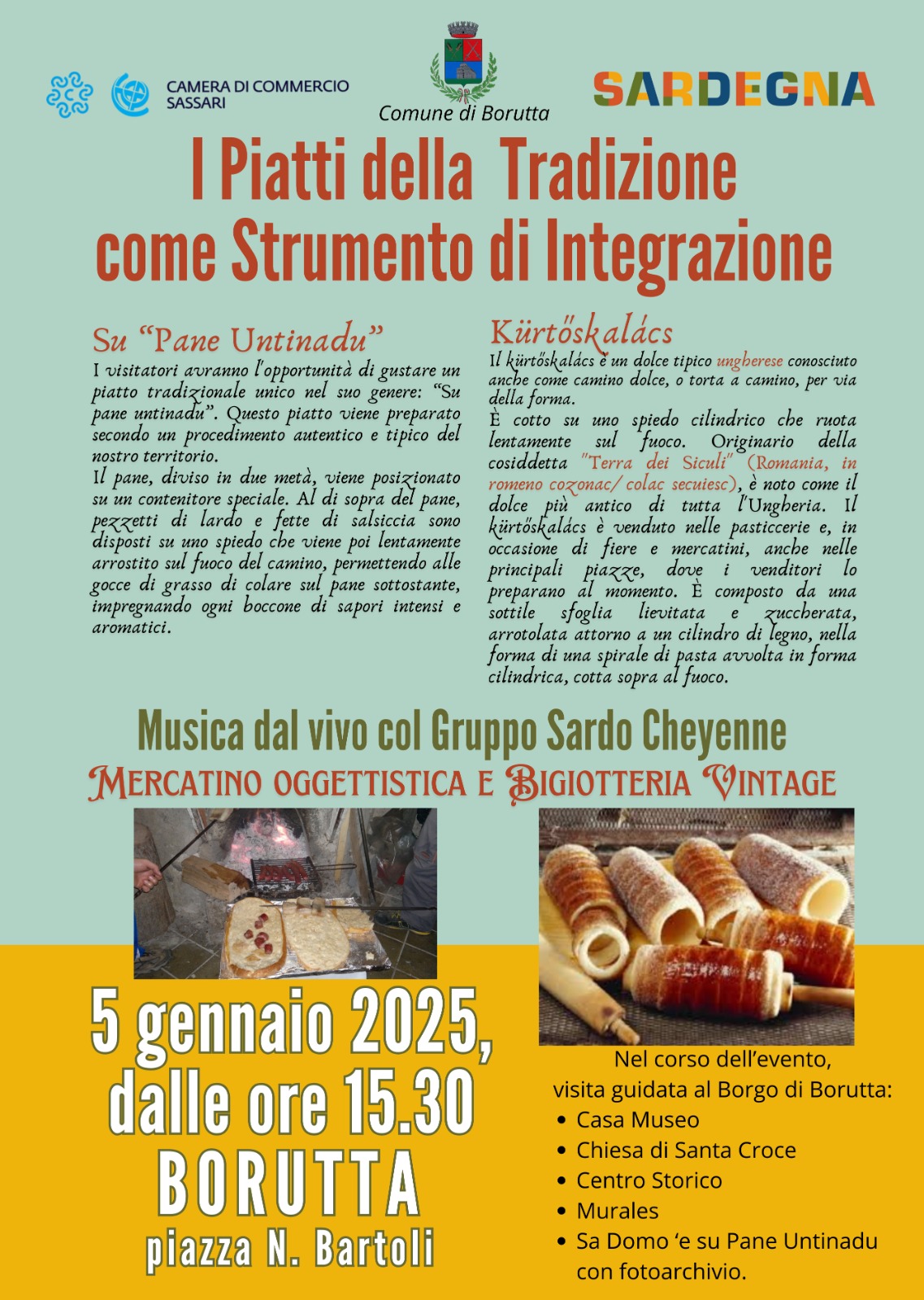 Si terrà domenica 5 gennaio, alle 15.30, in piazza Bartoli, a Borutta, la manifestazione “I piatti della Tradizione come strumento di Integrazione”. Per l’occasione “Su pane untinadu incontrerà il Kurtos Kalak, un dolce tipico ungherese.