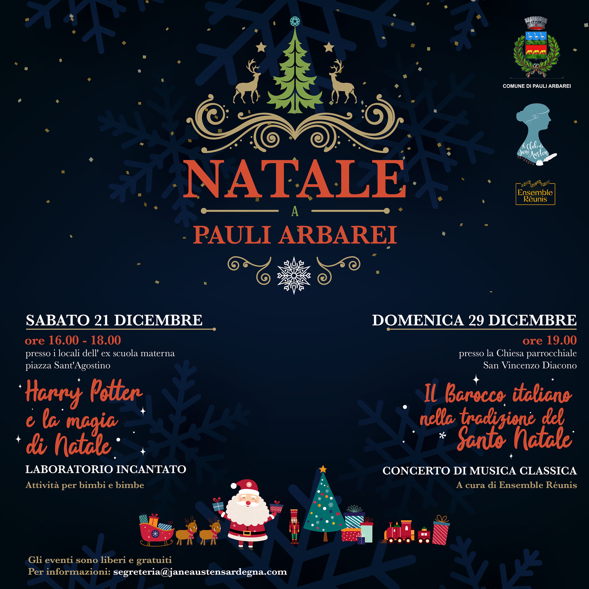 La magia del Natale arriva a Pauli Arbarei grazie a due straordinari appuntamenti. Il comune, in collaborazione con il club di Jane Austen Sardegna, organizza due iniziative per vivere e assaporare le atmosfere del momento più emozionante dell’anno.