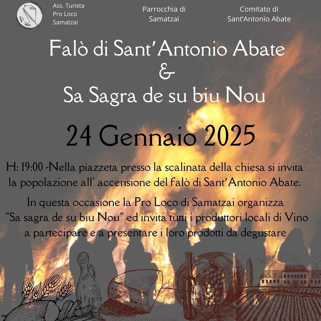 Si terrà il 24 gennaio 19.00 nella piazzetta presso la scalinata della chiesa di Samatzai, l’accensione del tradizionale falò di Sant’Antonio Abate. Seguirà anche la “Sa Sagra de su Biu Nou” la degustazioni di vino locale e prodotti tipici organizzato dalla Pro Loco di Samatzai, in collaborazione con i produttori Samatzesi.