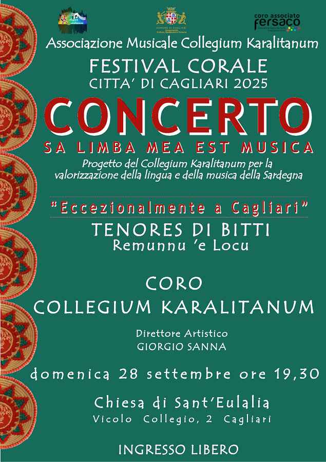 Tutto pronto, a Cagliari, per il  Festival Corale Città di Cagliari. Il primo appuntamento è in programma domenica 28 settembre, alle 19.30, nella chiesa di Sant’Eulalia, dove si esibiranno Tenores di Bitti Remunnu ‘e Locu. Sabato 11 ottobre, nella chiesa della Madonna del Suffragio, al Cep, sarà la volta del Coro Villa Ecclesiae con i Canti delle Miniere, mentre sabato 29 novembre, nella chiesa di San Giuseppe, nel quartiere Santa Teresa, l’internazionale Coro Serpeddì eseguirà dei canti campidanesi. L’ultimo evento è in programma sabato 20 dicembre, sempre nella chiesa di San Giuseppe, con il gruppo Cuncordia a Launeddas.