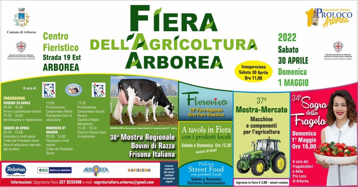 La mostra riserva un insieme di appuntamenti dedicati alla zootecnia con mostre, valutazioni, concorsi e sfilate dei capi appartenente alle aziende e allevamenti partecipanti con chiusura la domenica sera con la sfilata e il concorso giovani nella gara di conduzione che, con le sfilate dei capi in mostra, cattura l’attenzione e l’interesse del pubblico che assiepa il ring. Gli spazi dell’area fieristica sulla strada 19 Est saranno animati dalla presenza della mostra delle macchine, mezzi e componenti per l’agricoltura ma anche da un nutrito e qualificato numero di aziende ed imprese ad esporre produzioni del settore manifatturiero, mangimistico, dell’agroalimentare e delle componenti informatiche applicate all’agricoltura ed agli allevamenti. Ci sarà spazio anche per Floroviva, la fiera regionale ortoflorovivaistica mentre nel pomeriggio di domenica primo maggio, a partite dalla 16.00 appuntamento con l’attesa vendita dei plateau di fragole a cura dei fragolicoltoari di Arborea e della conseguente Sagra delle fragole offerte dai produttori locali e dalla Pro Loco di Arborea con la panna della 3A. Spazio, infine, all’enogastronomia con Tavola in Fiera ed i prodotti locali per la quale occorre munirsi di ticket e a cura dei giovani della Pro Loco Street Food, lo stesso con le produzioni del luogo.