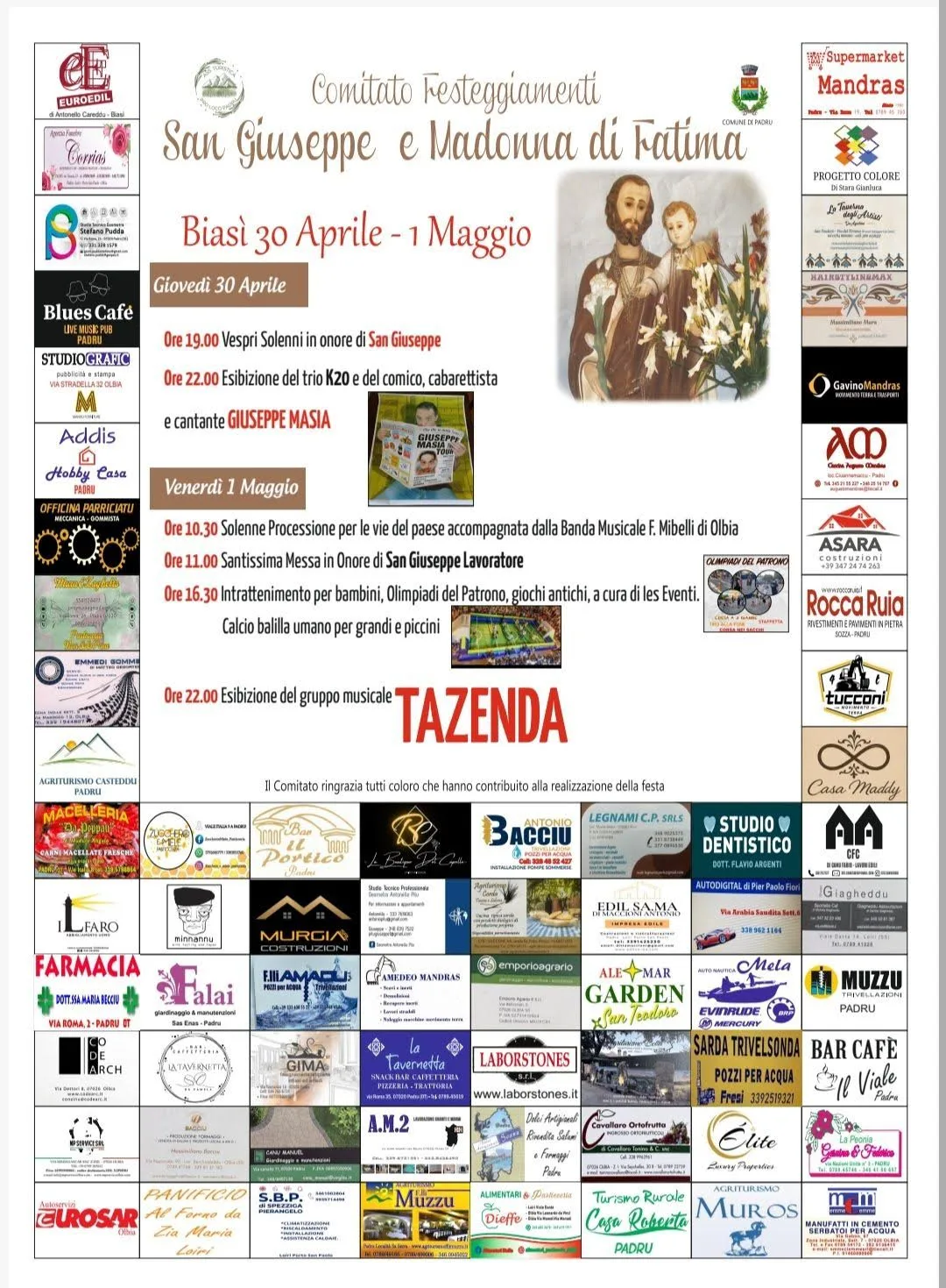 Venerdì 1 maggio, alle 10.30, ci sarà la processione per le via del paese, con la presenza della banda musicale “F. Mibelli” di Olbia, seguita, alle 11.00, dalla celebrazione della Santa Messa. Alle 16.30, sono in programma un intrattenimento per bambini e il “Calcio Balilla”. Alle 22.00 si terrà il concerto dei Tazenda.