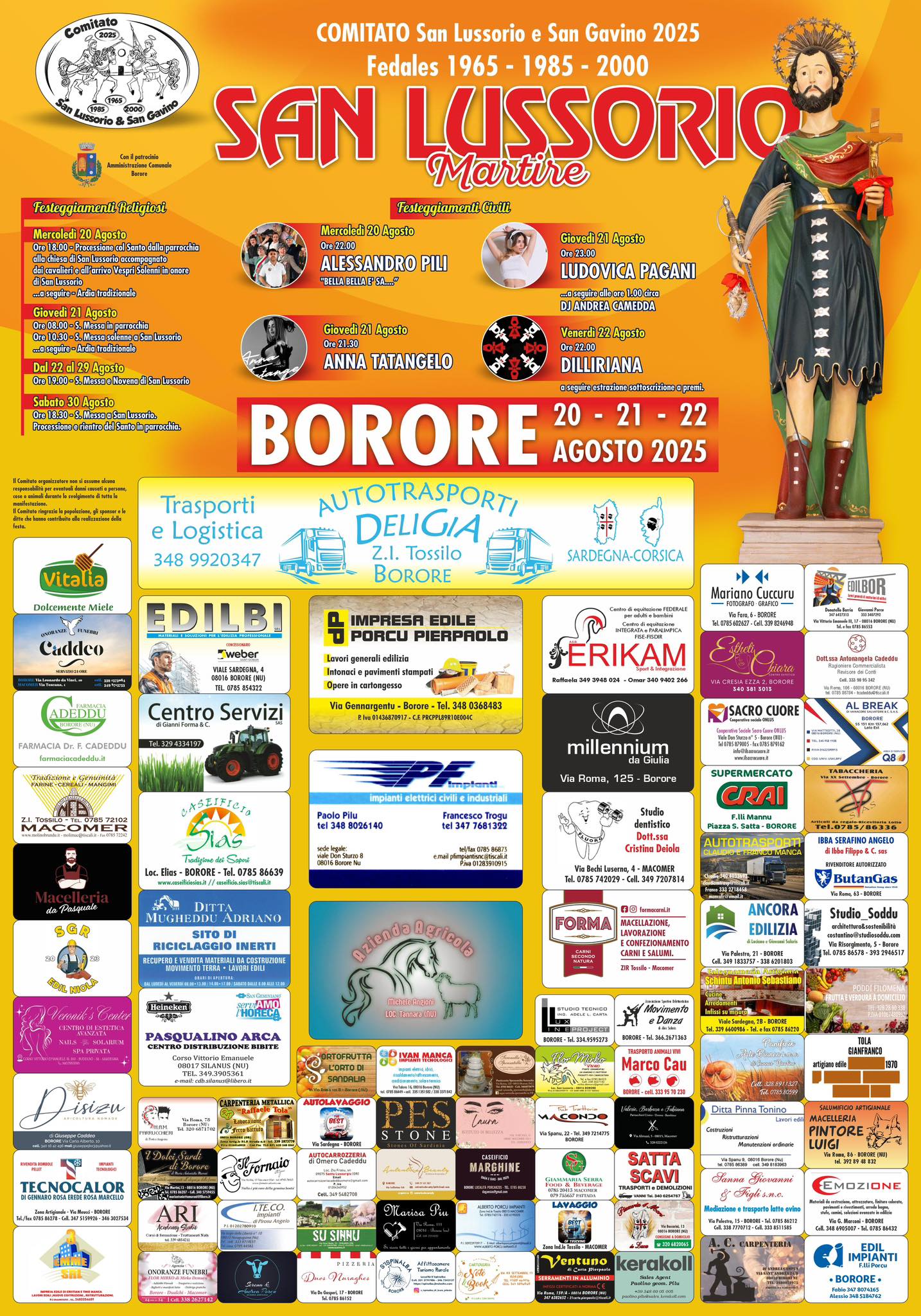 Il comitato 2025 (leve 1965, 1985 e 2000) ha predisposto il programma dei festeggiamenti in onore di San Lussorio, a Borore. Domani 20 agosto, alle 18.00, ci sarà la processione che dalla parrocchia accompagnerà la statua del Santro in direzione della Chiesa campestre dove saranno celebrati i Vespri solenni. Seguirà la tradizionale Ardia. Alle 22.00, si esibirà Alessandro Pili.