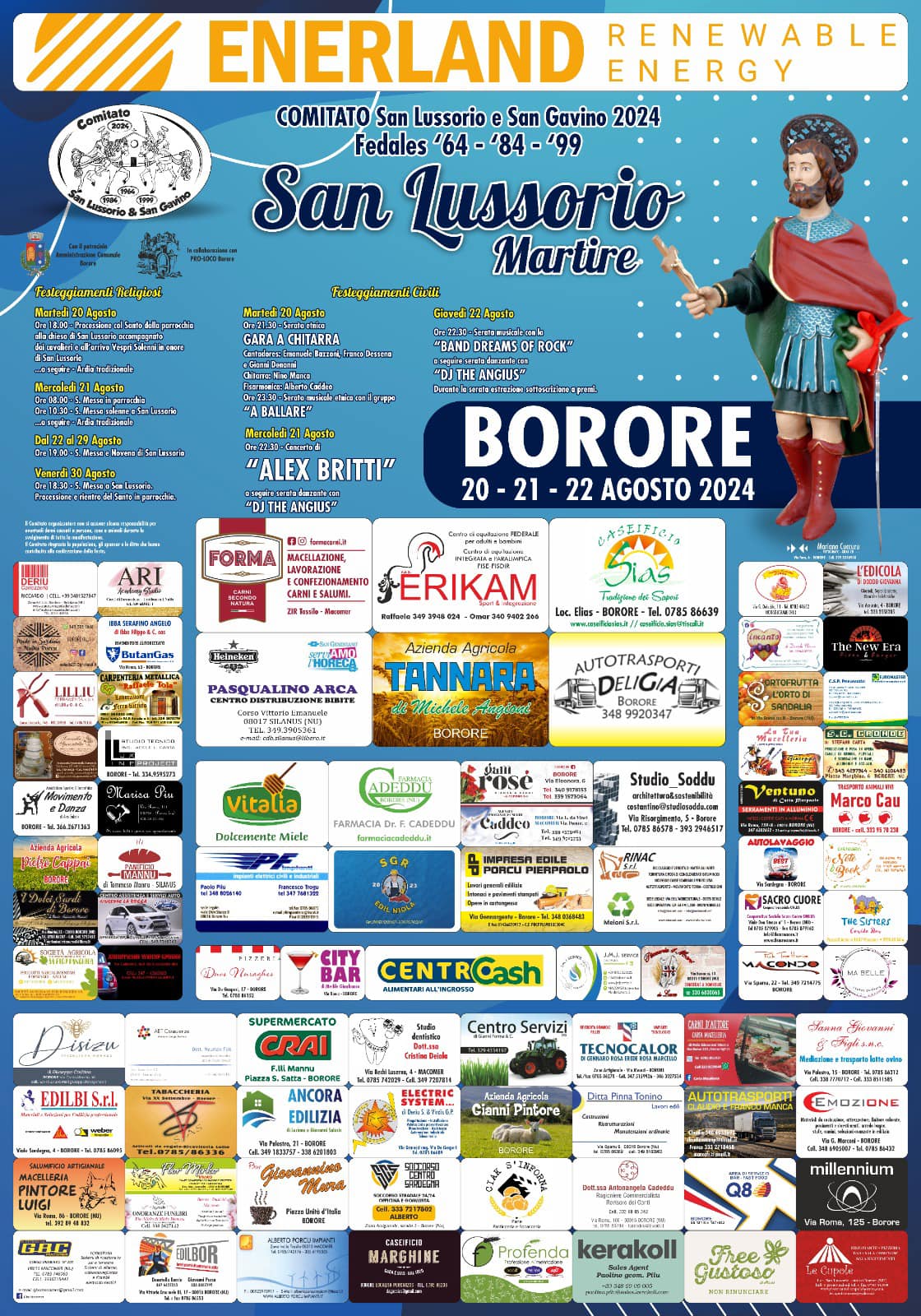 Borore festeggia San Lussorio. Martedì 20 agosto, alle 18.00, si comincerò con la processione dalla parrocchia sino alla Chiesa di San Lussorio accompagnata dai cavalieri. All’arrivo saranno recitati i Vespri solenni. Seguirà l’ardia tradizionale. Martedì 20 agosto, alle 21.30, spazio alla gara a chitarra con Emanuele Bazzoni, Franco Dessena e Gianni Denanni accompagnati alla chitarra da Nino Manca e alla fisarmonica da Alberto Caddeo. Alle 23.30 sarà la volta dello spettacolo del gruppo “A Ballare”.