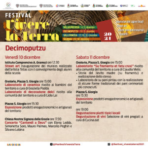 Il Festival Vivere la Terra arriva a Decimoputzu. Venerdì 10 Dicembre e Sabato 11 Dicembre nel Comune del Sud Sardegna si terrà il secondo appuntamento del Festival Vivere la Terra, un’iniziativa promossa dall’Unione dei Comuni “I Nuraghi di Monte Idda e Fanaris” che comprende i Comuni di Decimoputzu, Siliqua, Vallermosa e Villaspeciosa, sostenuto della Fondazione di Sardegna e della Regione Autonoma della Sardegna – Assessorato alla P.I. BB. CC ed è organizzato dall’Associazione Enti Locali per le Attività Culturali e di Spettacolo.