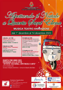 Domani venerdì 1 dicembre 2023 partono gli appuntamenti della rassegna “Aspettando il Natale a Quartu Sant’Elena – Musica Teatro Animazione” organizzati dall’Associazione Culturale Palazzo d’Inverno nell’ambito dell’iniziativa “Quartu Fine Anno 2023 – Ripensare la e le città” patrocinata dal Comune di Quartu Sant’Elena per rafforzare le capacità attrattive, culturali, turistiche ed economiche del territorio. Fino a giovedì 14 dicembre la città sarà quindi animata da eventi di forte richiamo per la cittadinanza con un cartellone artistico che, inserito durante il periodo natalizio, mira alla partecipazione attiva degli abitanti e all’inclusione di un turismo diffuso.