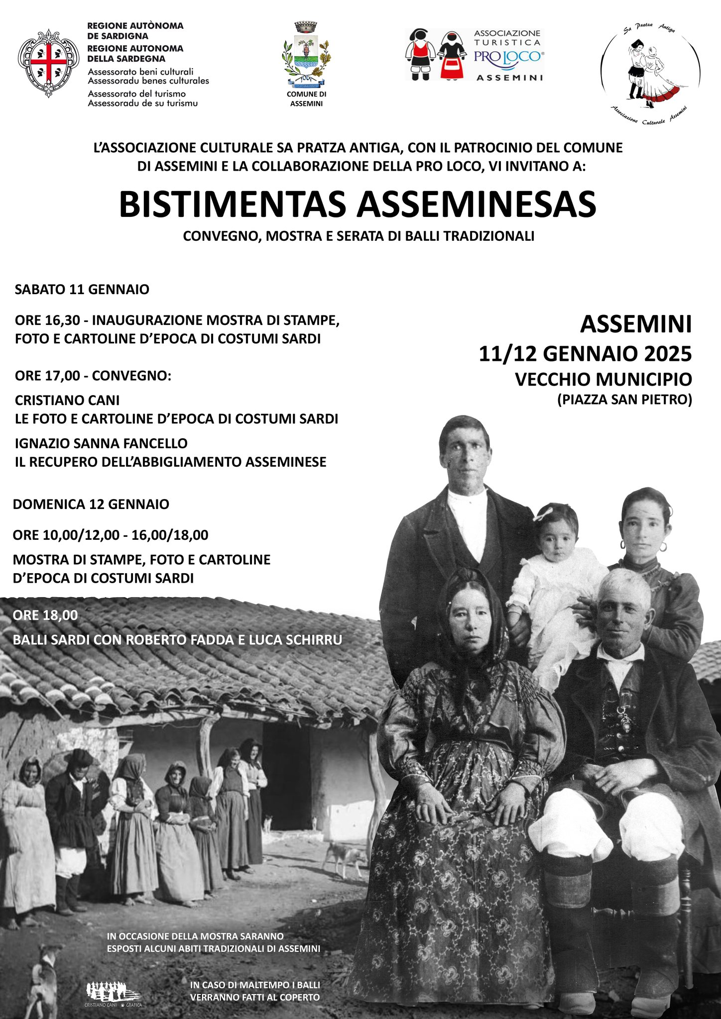 Sabato 11 gennaio, alle 16.30, è prevista l’inaugurazione della mostra di stampe, foto, e cartoline d’epoca di costumi sardi. Alle 17.30, si terrà un convegno al quale parteciperanno Cristiano Cani (le foto e cartoline d’epoca di costumi sardi) e Ignazio Sanna Fancello (il recupero dell’abbigliamento asseminese).