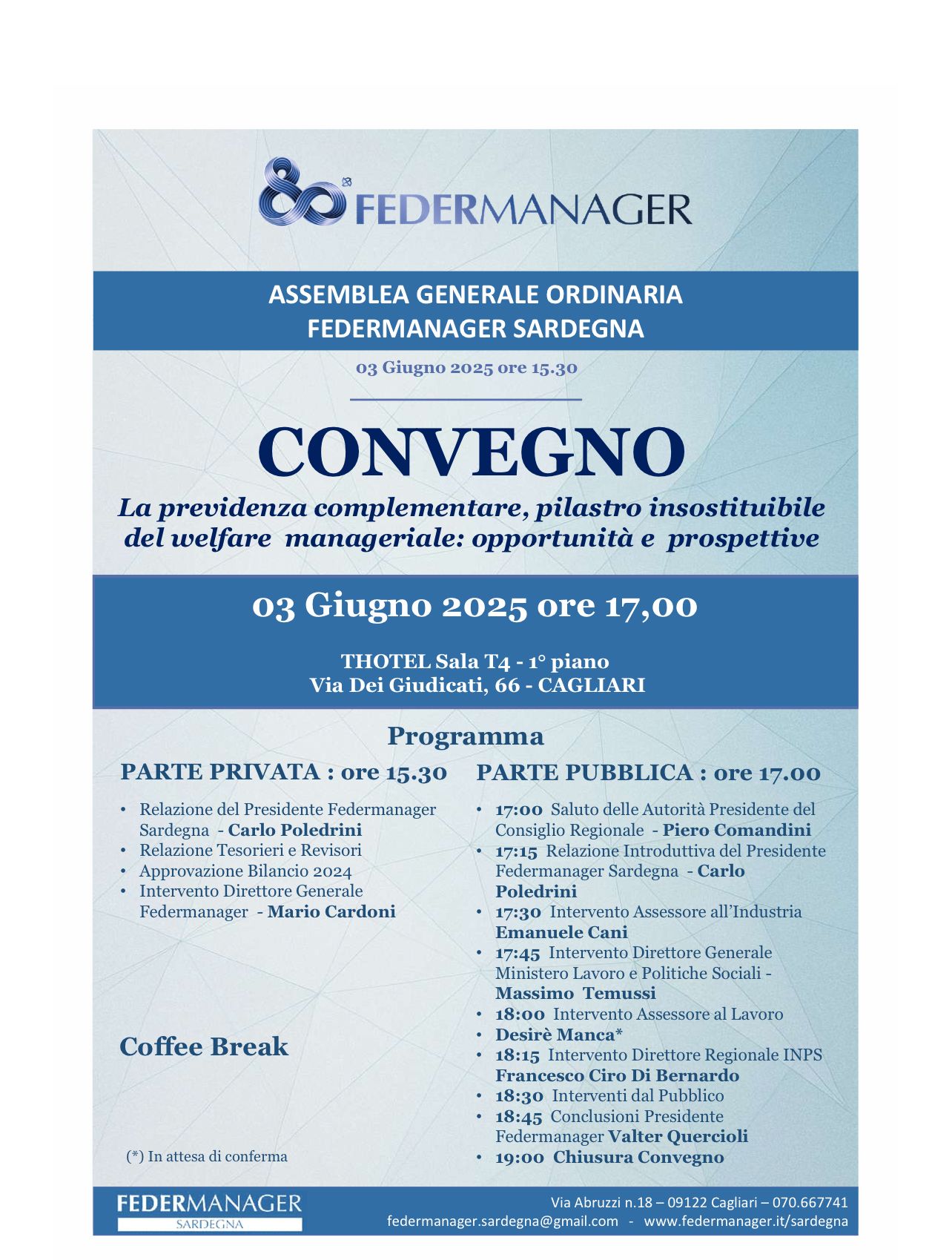 E’ in programma martedì 3 giugno, alle 15.30, presso la sala T4 del THotel, in via dei Giudicati 66, a Cagliari, l’Assemblea Ordinaria Generale Annuale di Federmanager Sardegna. L’Assemblea si inserisce nell’ambito degli eventi che si concluderanno a fine anno con la ricorrenza dell’80esimo Anniversario Nazionale della costituzione di Federmanager.