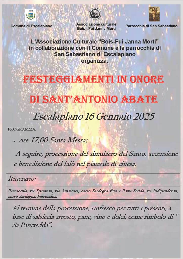 E’ tutto pronto, a Escaplano, per i festeggiamenti in onore di Sant’Antonio Abate promossi dall’Associazione culturale “Bois-Fui Janna Morti” in collaborazione con il comune e la parrocchia di San Sebastiano.