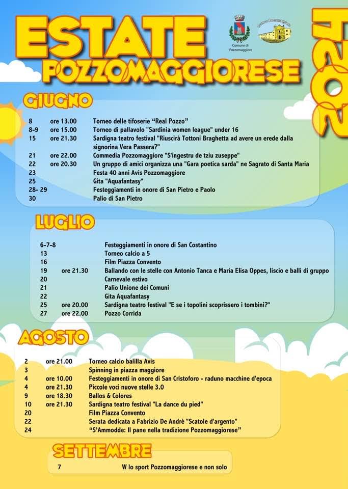 il 23 giugno saranno celebrati i quarant’anni dell’Avis di Pozzomaggiore. Il 25 giugno ci sarà la gita all’Aquafantasy. Il 28 e 29 giugno spazio alla festa dei Santi Pietro e Paolo. Il 30 giugno andrà in scena il palio di San Pietro.