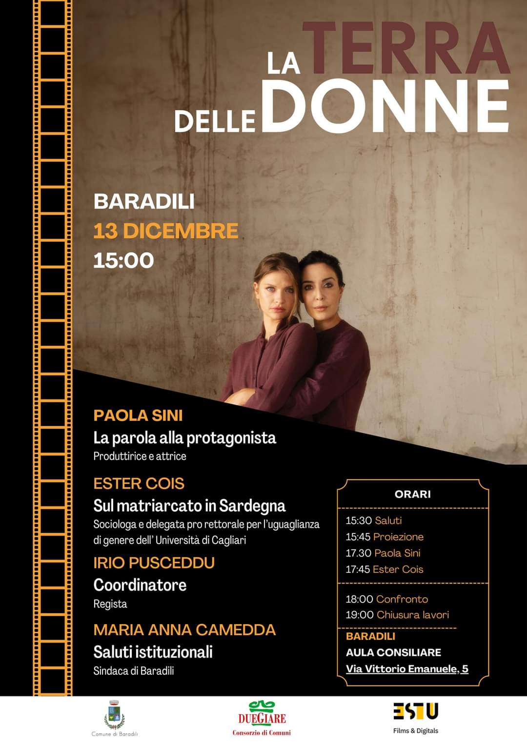 A Baradili, venerdì 13 dicembre alle 15.30, nell’aula consiliare, è in programma un nuovo appuntamento per sensibilizzare tutti su questo tema importante organizzato dal Comune, dal Consorzio Due Giare e da “Estu”. Si comincerà con la proiezione del film “La terra delle donne”, per seguire con un dialogo con Paola Sini, protagonista della pellicola e produttrice cinematografica. Prenderà poi la parola la sociologa Ester Cois con un intervento sul matriarcato in Sardegna. Dalle 18.15, spazio alla discussione aperta a tutti. L’incontro sarà aperto dai saluti della sindaca Maria Anna Camedda e coordinato dal regista Irio Pusceddu.