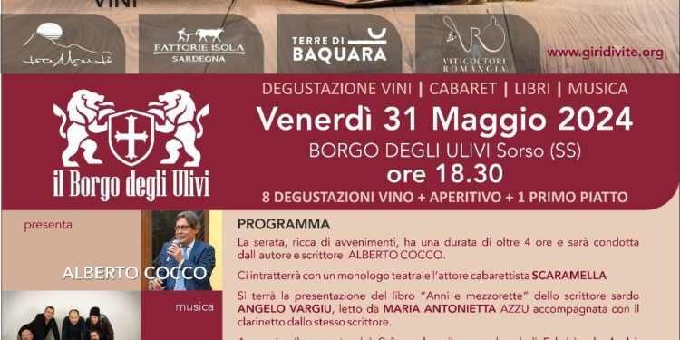 Assaporare i vini del territorio degustando piatti a tema tra musica, letteratura e cabaret. Un mix di grande effetto per “Giri di vite”, l’evento eno-culturale che venerdì 31 maggio, a partire dalle 18.30, porterà al Borgo degli Ulivi di Sorso le note dei Crêuza de mä, il reading dello scrittore Angelo Vargiu e le divertenti performance del cabarettista Scaramella. La serata sarà condotta da Alberto Cocco seguendo il filo conduttore dei vini di Sardegna, per un format ideato e organizzato da Carlo Petretto e Luca Manca con l’associazione culturale SardegnaE20.