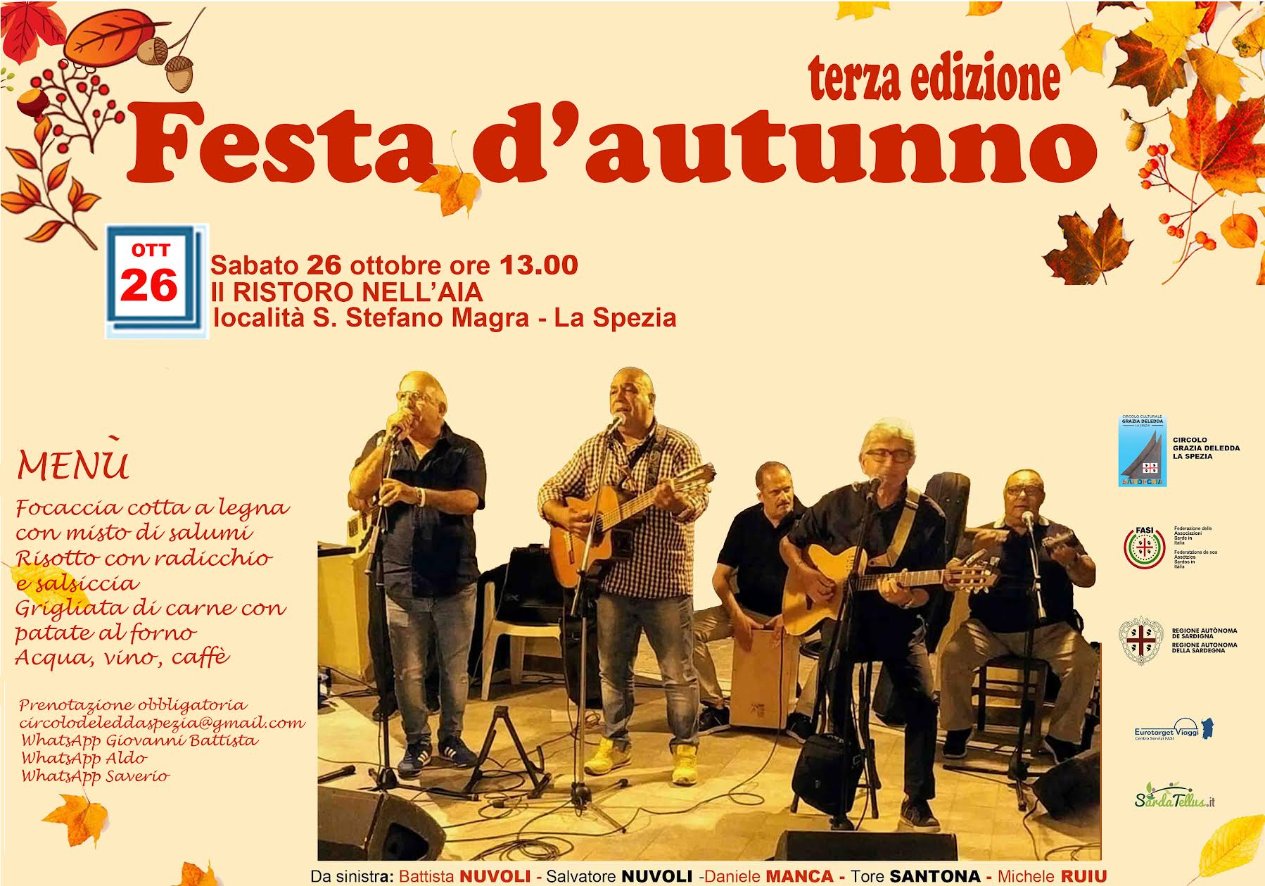 Il 26 ottobre torna la Festa d’Autunno a La Spezia. Inaugurare in compagnia e amicizia la magia dell’autunno è ormai un’attesa abitudine per il Circolo Deledda. Una festa che il rinnovato Gruppo Direttivo ha voluto confermare per mettersi alle spalle un’estate, mai così calda e per segnare la ripartenza di un autunno operoso e pieno di rinnovati propositi.
