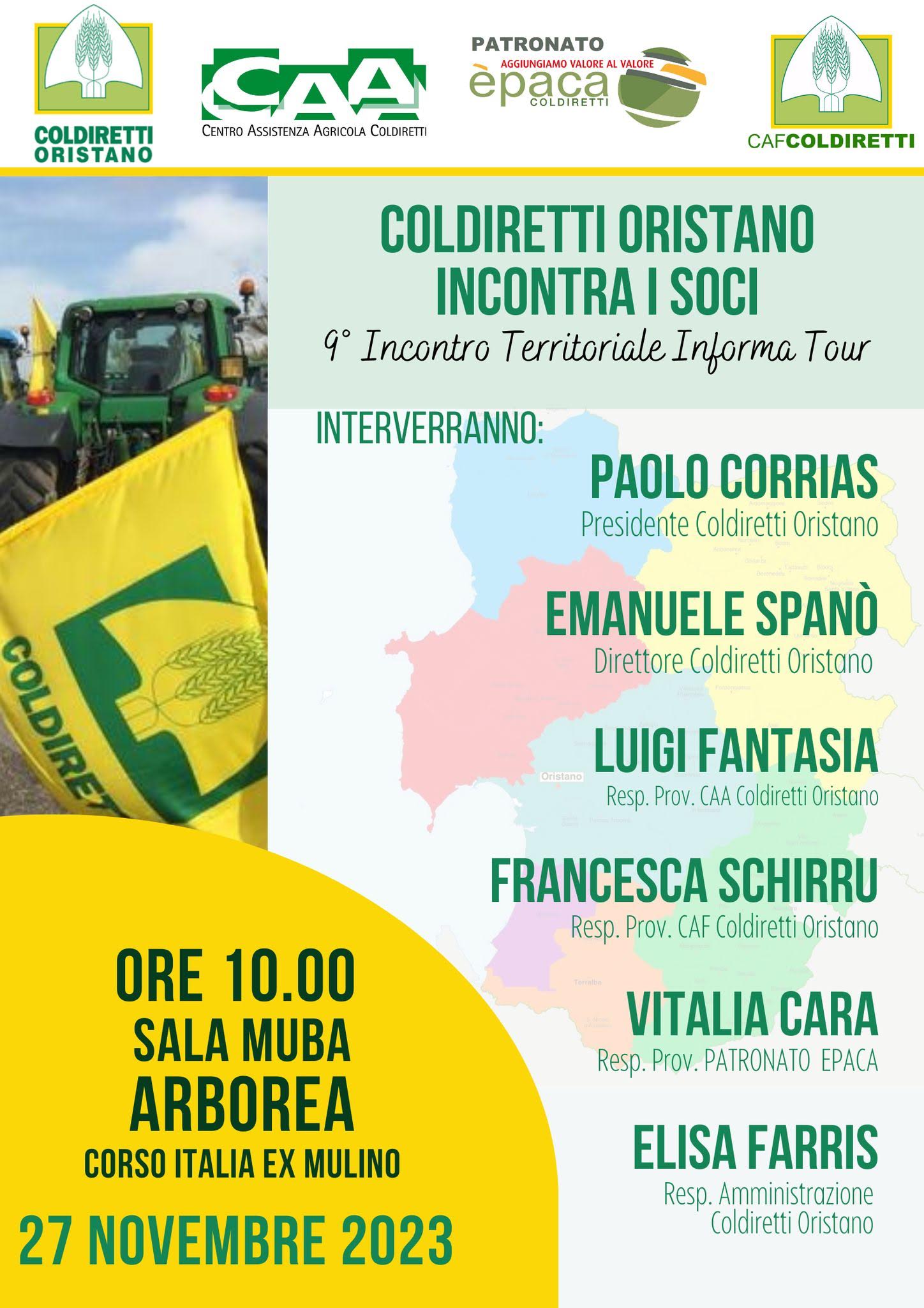 Tappe. Il tour era partito dall’Alto oristanese e si è svolto in 9 tappe per 2 mesi di incontri tra: Santu Lussurgiu, Cuglieri, Oristano, Narbolia, San Nicolò D’Arcidano, Ghilarza, Samugheo, Ales, Arborea, alle quali hanno partecipato il presidente e il direttore di Coldiretti Oristano, Paolo Corrias ed Emanuele Spanò, la responsabile provinciale del patronato Epaca, Vitalia Cara, la responsabile provinciale del CAF, Francesca Schirru, la responsabile dell’Amministrazione, Elisa Farris e il responsabile provinciale del CAA, Luigi Fantasia.