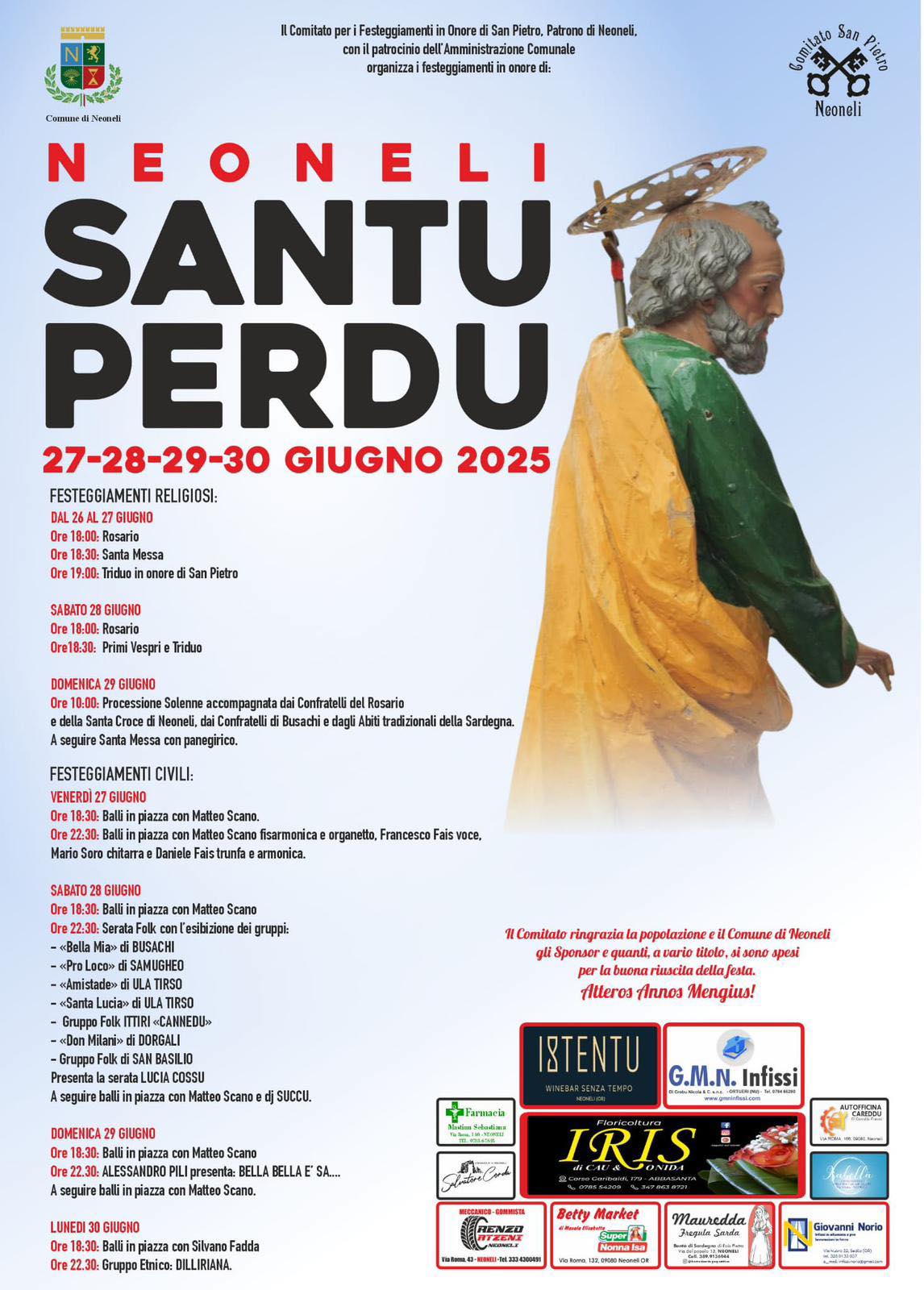 Domenica 29 giugno, alle 19.00, è in programma la processione accompagnata dai Confratelli del Rosario e di Santa Croce di Neoneli, dai confratelli di Busachi e dagli abiti tradizionali della Sardegna. Seguirà la celebrazione della Santa Messa con panegirico. Alle 18.30, ritornano i balli in piazza con Matteo Scano. Alle 22.30, sarà la volta dell’esibizione di Alessandro Pili che presenta “Bella Bella e SA…”. Subito dopo spazio nuovamente a Matteo Scano.