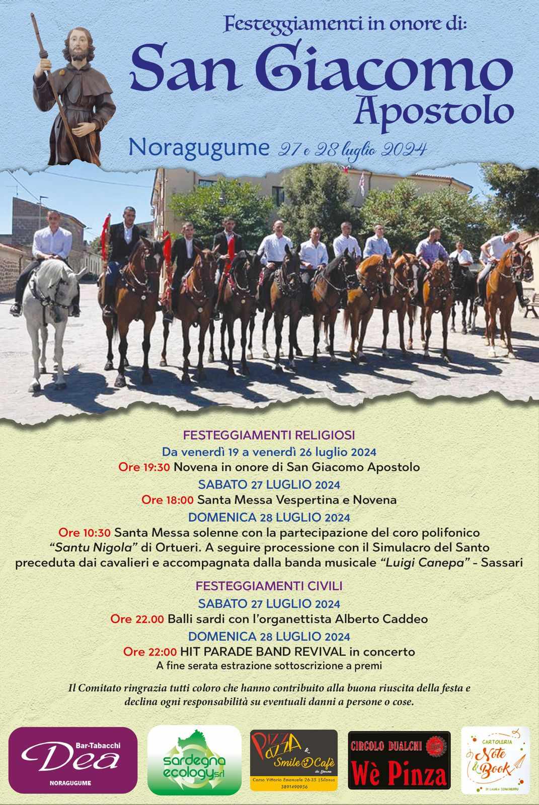 Noragugume si prepara per i festeggiamenti in onore di San Giacomo. Sabato 27 luglio, alle 18.00, saranno celebrati la Santa Messa Vespertina e la Novena. Alle 22.00 sono previsti i balli sardi eseguiti dall’organettista Alberto Caddeo.