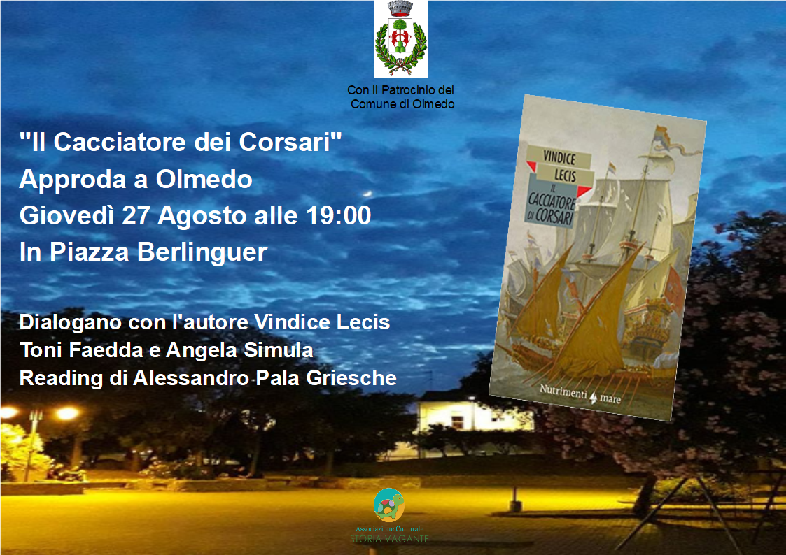 Doppio appuntamento domani 27 agosto in piazza Berlinguer, ad Olmedo. Dalle 19.00 è in programma la presentazione del libro “Il Cacciatore dei Corsari” di Vindice Lecis, inserito dall’assessore alla cultura, Gianluca Pinna, nel programma dell’estate olmedese.