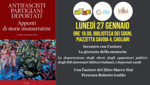 L’appuntamento è lunedì 27 gennaio, alle ore 18.00, nella biblioteca dei Sogni, in piazza Savoia 4, a Cagliari. Sarà presente l’autore del libro Marco Sini che parlerà dei cittadini sardi deportati nei campi di lavoro, sterminio e concentramento: circa 290 tra ebrei, oppositori politici e renitenti leva e circa 2.500-3.000 sardi IMI (Internati Militari Italiani). Introduce e modera l’incontro Roberto Loddo, del manifesto sardo.