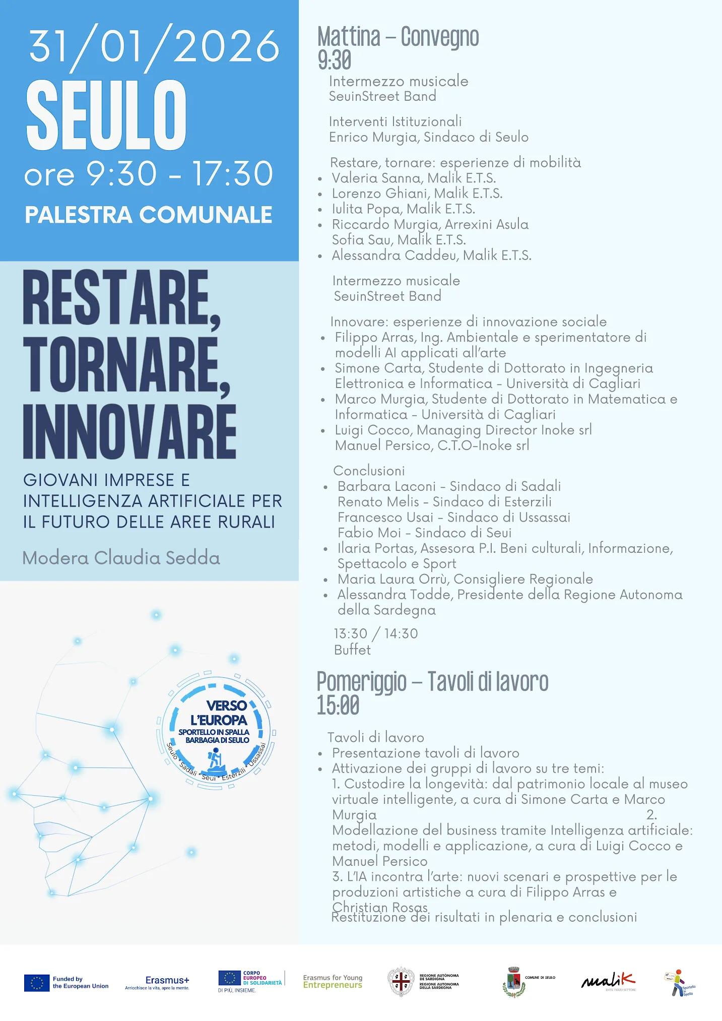 L’evento è promosso da Malik E.T.S., impegnata da anni in Sardegna e in ambito europeo nella promozione della mobilità giovanile e dell’innovazione sociale, in collaborazione con istituzioni locali, università e imprese. Le attività si inseriscono nel quadro dei programmi europei Erasmus+, Corpo Europeo di Solidarietà ed Erasmus for Young Entrepreneurs, strumenti che offrono ai giovani occasioni di formazione, scambio e crescita professionale, anche nei contesti rurali e periferici. Il convegno rappresenta il momento conclusivo del progetto “Verso l’Europa: Sportello in spalla in Barbagia di Seulo”, promosso dal comune di Seulo e da Malik E.T.S., in collaborazione con i Comuni di Sadali, Seui, Esterzili e Ussassai e finanziato dalla Regione Autonoma della Sardegna.