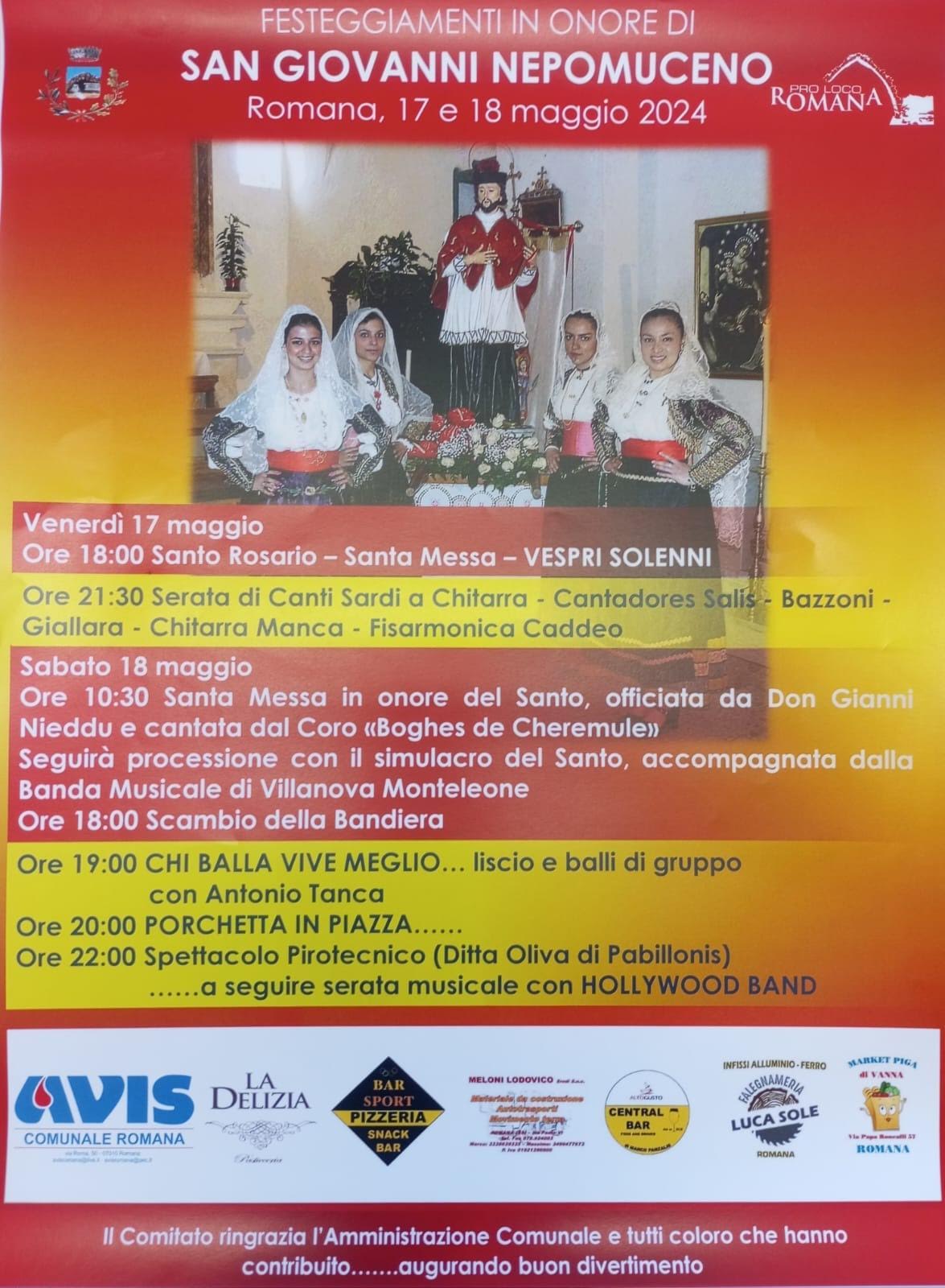 Romana si prepara per festeggiare San Giovanni Nepomuceno. Venerdì 17 maggio, alle 18.00, ci saranno il Santo Rosario, la Santa Messa e i Vespri solenni. Alle 21.30 è prevista la serata dedicata ai canti sardi a chitarra con Daniele Giallara, Salvatorangelo Salis ed Emanuele Bazzoni accompagnati alla chitarra da Nino Manca e alla fisarmonica da Alberto Caddeo.