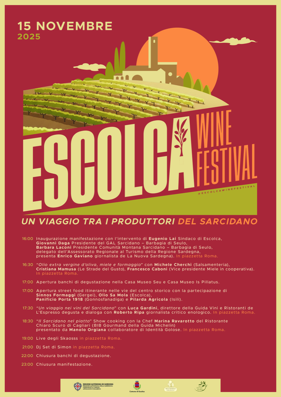 Sabato 15 novembre 2025, il cuore dell’entroterra sardo ospita la prima edizione dell’Escolca Wine Festival, una giornata dedicata ai vini, ai sapori e ai produttori del territorio. Tra degustazioni guidate, talk, show cooking e musica dal vivo, il borgo di Escolca diventerà un palcoscenico diffuso per celebrare l’identità agricola e gastronomica del territorio, in un evento che unisce cultura, convivialità e tradizione.