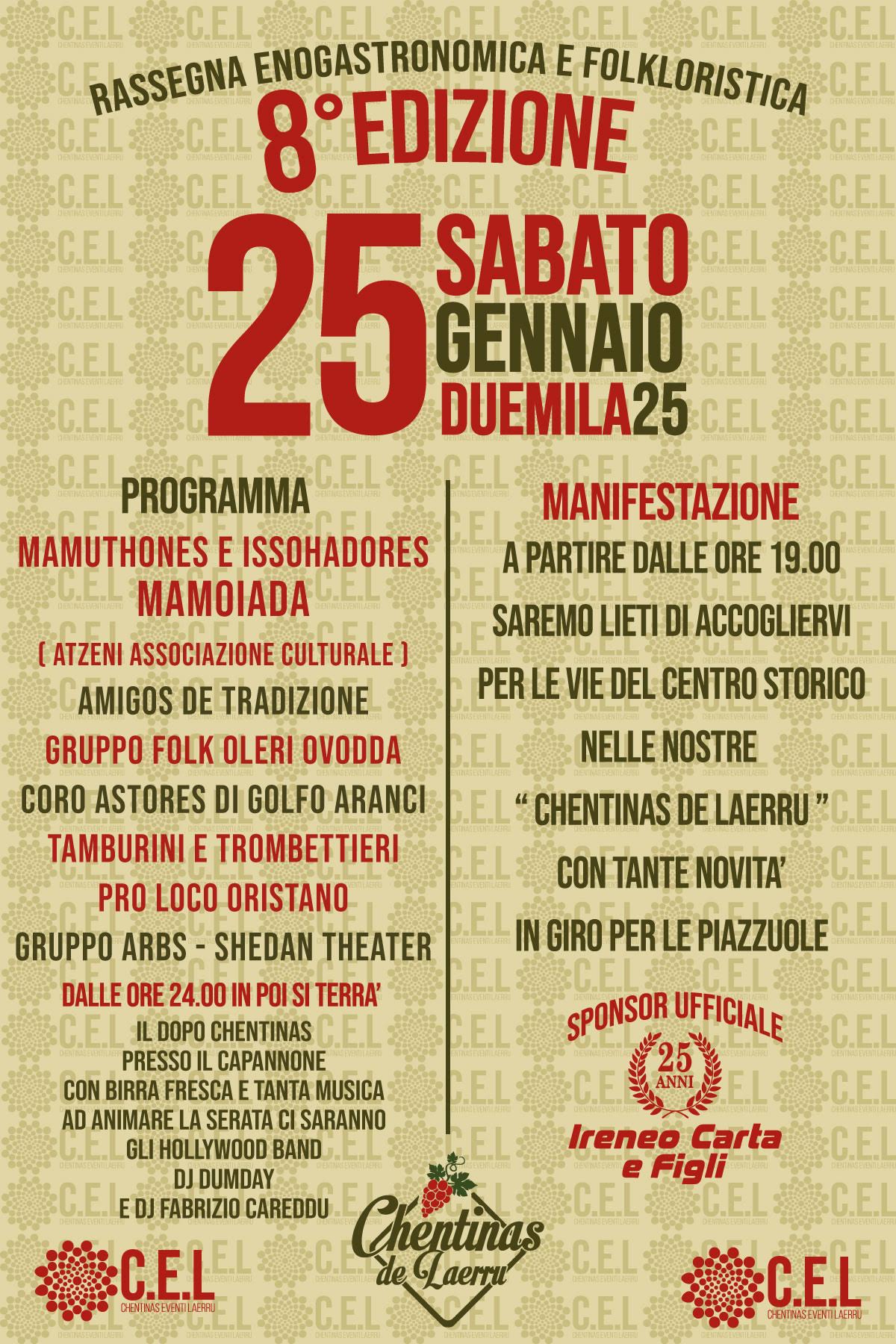 Oltre alla degustazione di piatti e vino tipici locali, è prevista anche la presenza dei “Mamuthones e Issohadores” di Mamoiada (associazione culturale Atzeni), “Amigos de Tradizione”, il “Gruppo folk Oleri” di Ovodda, il “Coro Astores” di Golfo Aranci, i “Tamburini e Trombettieri” di Oristano e il “Gruppo Arbs-Shedan Theater”. Dalle 24.00, in poi si terrà il dopo “Chentinas” presso il capannone.