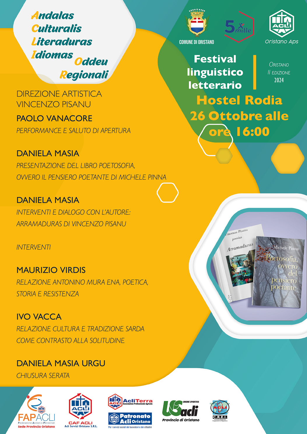 Ripercorrere tracce antiche che aiutino a ripensare la visione del futuro. Questo l’intento delle Acli provinciali di Oristano, che con un nutrito gruppo di sponsor organizzano la seconda edizione del festival “Andalas Culturalis, Literaduras, Idiomas. Oddeu Regionali”. La manifestazione si svolgerà sabato 26 e domenica 27 ottobre all’Hostel Rodia di Oristano, sotto la direzione artistica di Vincenzo Pisanu.