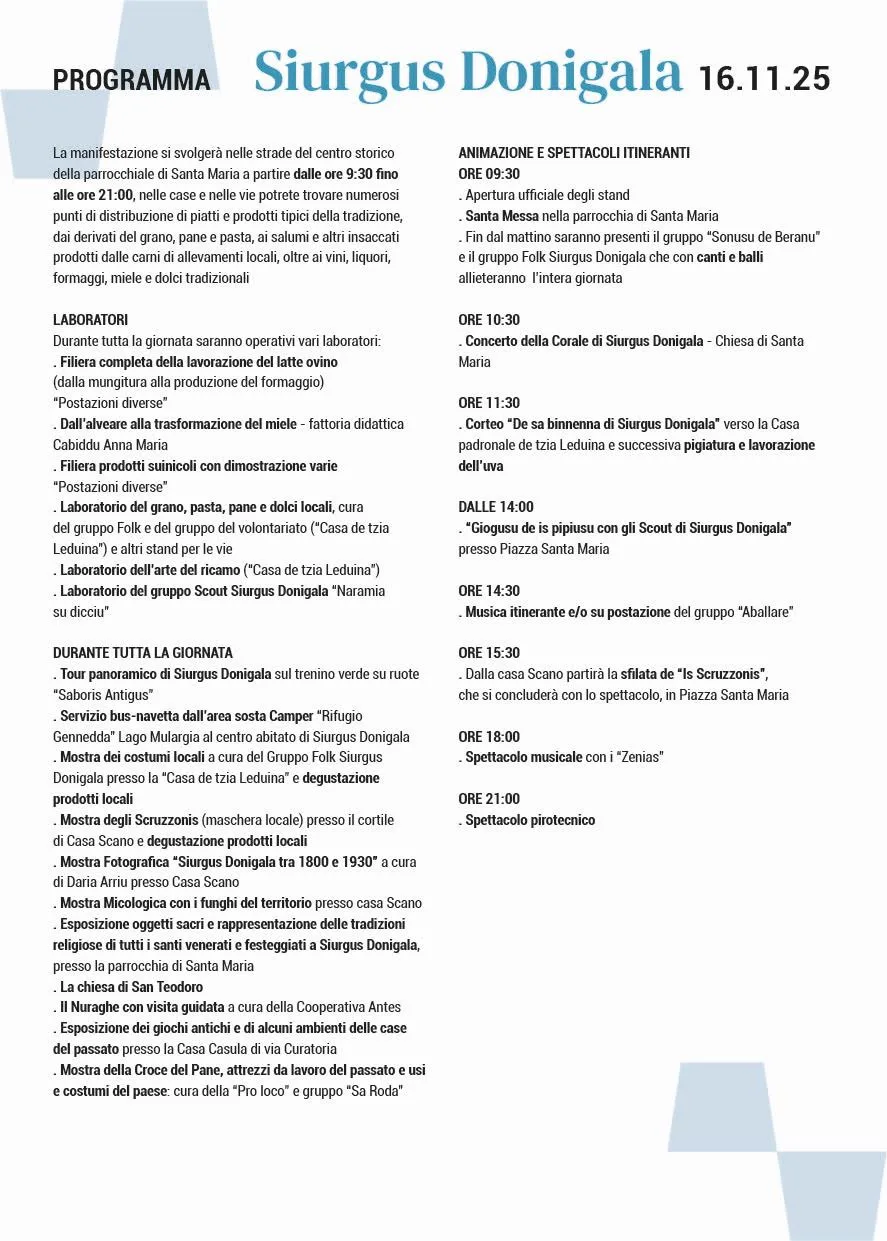 Nel pomeriggio, spazio al divertimento con i giochi e le attività dedicate ai più piccoli a cura degli Scout e con la musica itinerante del gruppo “Aballare”. Dalle 15.30 si terrà la sfilata de “Is Scruzzonis”, maschere tradizionali che animeranno le vie del centro fino a Piazza Santa Maria, dove alle 18.00 è previsto lo spettacolo musicale dei Zenias. Gran finale alle 21.00 con un suggestivo spettacolo pirotecnico.