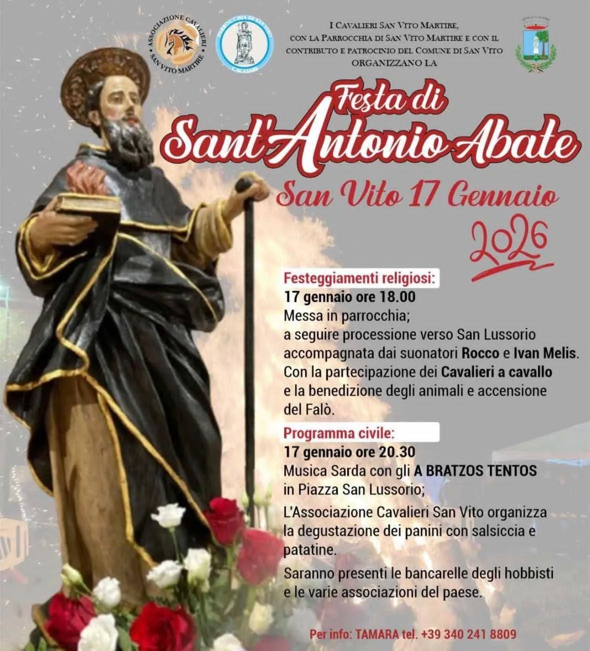 San Vito festeggia Sant’Antonio Abate. Il programma, organizzato dai cavalieri e dalla Parrocchia, con il contributo del Comune, prevede, sabato 17 gennaio, alle 18.00, la Santa Messa seguita dalla processione accompagnata dai suonatori Rocco e Ivan Melis e con la partecipazione dei cavalieri. In programma anche la benedizione degli animali e l’accensione del falò.