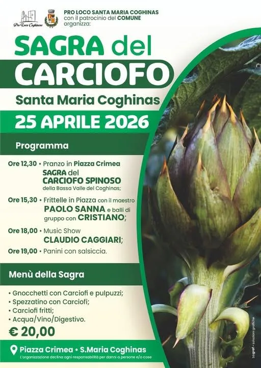 Sabato 25 aprile, Santa Maria Coghinas ospiterà l’edizione numero diciotto della Sagra del carciofo, organizzata dalla Pro Loco in sinergia con imprenditori e la Cooperativa del Coghinas, il patrocinio e contributo del Comune.