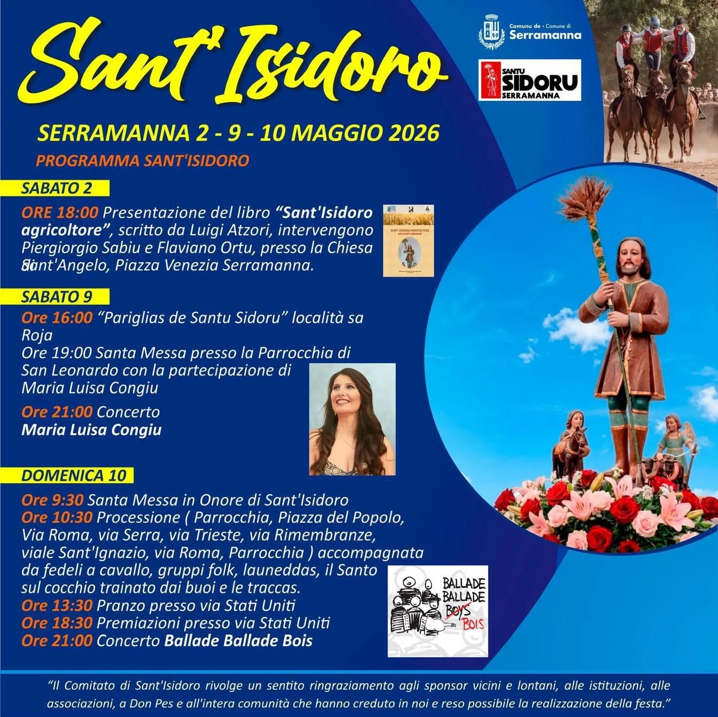 Domenica 10 maggio, alle 9.30, sarà celebrata la Santa Messa. Alle 10.30, partirà la processione alla presenza dei fedeli a cavallo, dei gruppi folk e delle launeddas. Alle 13.30, è previsto il pranzo in via Stati Uniti. Alle 18.30, sono in programma le premiazioni. Alle 21.00, spazio all’esibizione dei gruppo “Ballade Ballade Bois”.