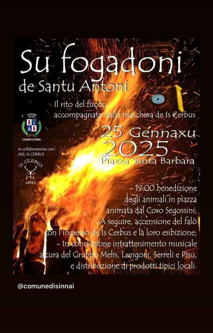 Sabato 25 gennaio Sinnai celebra “Su Fogadoni de Santu Antoni”. Il programma partirà alle 19.00, in piazza Santa Barbara, con la benedizione degli animali animata dal coro Segossini. Subito dopo ci sarà l’accensione del falò con l’ingresso de Is Cerbus. In conclusione ci sarà un’intrattenimento musicale con il gruppo Melus, Longoni, Serreli e Pisu. Saranno distribuiti anche prodotti locali.