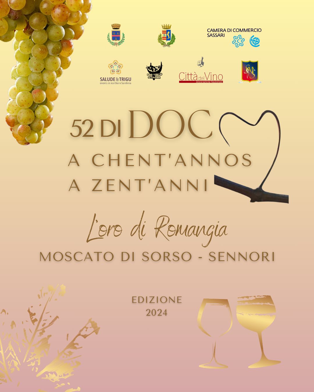 Inizia domani, 4 ottobre, “A chent’annos”, tre giorni di appuntamenti organizzati da Pro Loco Sennori, comuni di Sennori e Sorso, associazione “Città del Vino” e Confraternita del Moscato Sorso-Sennori, per celebrare i 52 anni della Doc del moscato di Romangia.