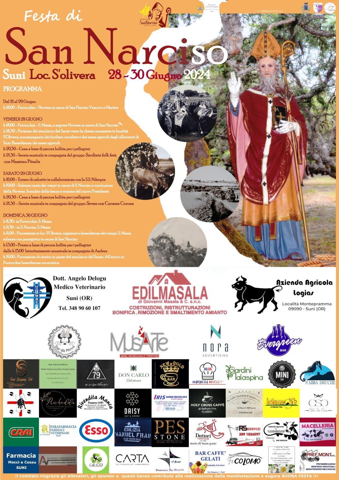 Domenica 30 giugno, alle 8.30, Santa Messa in parrocchia, mentre alle 9.30 sarà celebrata nella Chiesa campestre di San Narciso. Alle 11.30 si svolgerà la processione in località “S’olivera”, con le rogazioni e la benedizione dei campi, seguita dalla Santa Messa solenne. Alle 13.00 pecora bollita per i pellegrini. Dalle 15.00 intrattenimento musicale con Andrea. Alle 19.00 l’atto finale della festa con il rientro, in processione, del simulacro di San Narciso in paese e la benedizione eucaristica.