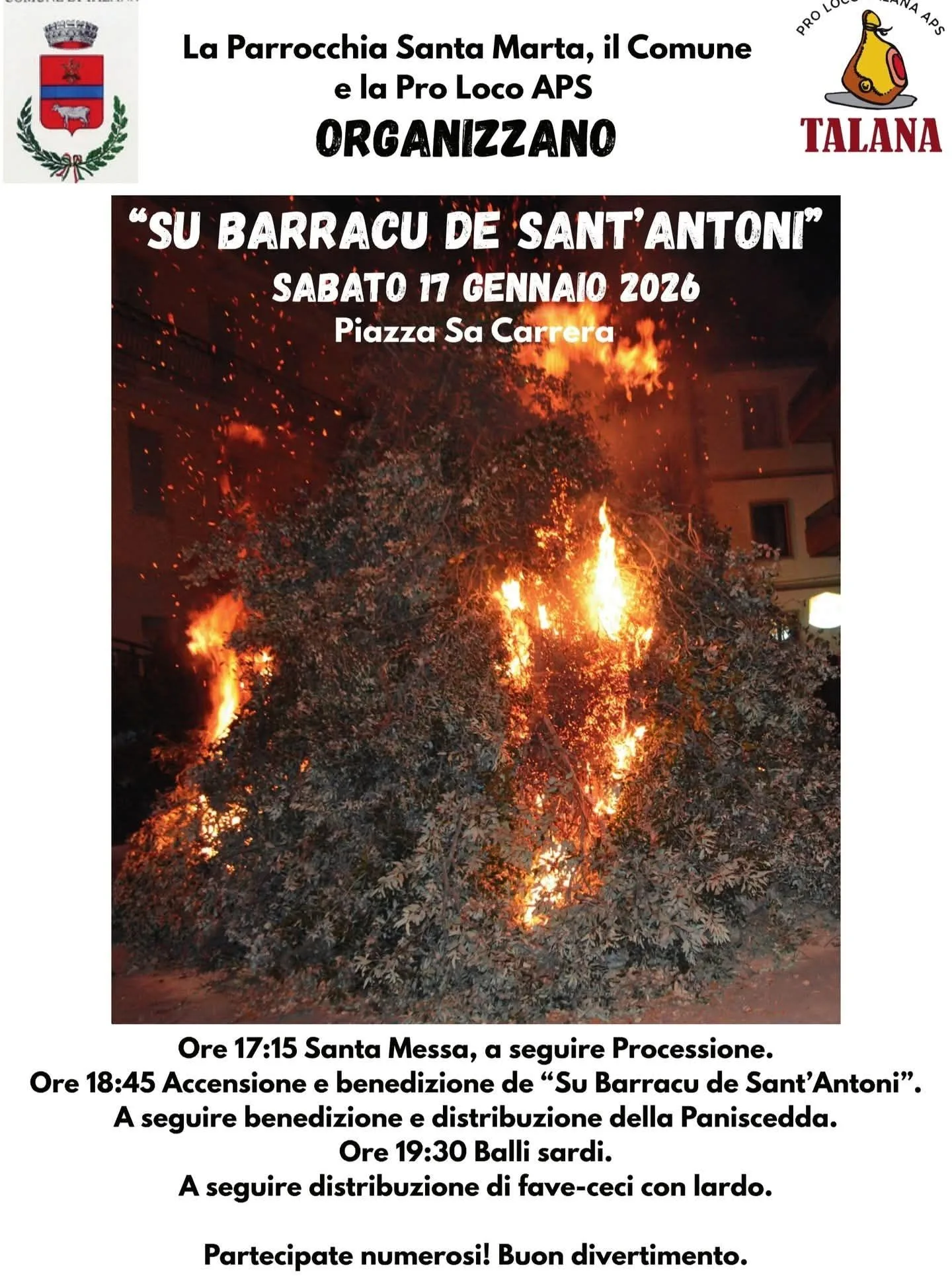 Si terrà sabato 17 gennaio, a Talana, “Su barracu de Sant’Antoni”, organizzato dalla parrocchia di Santa Marta in piazza Sa Carrera.