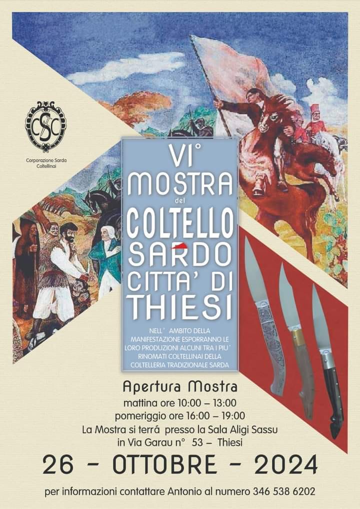Thiesi è pronto per la sesta mostra del coltello sardo “Città di Thiesi”. L’esposizione, che si terrà il 26 ottobre, si terrà nella sala Aligi Sassu e sarà visitabile la mattina dalle 10.00 alle 13.00 e il pomeriggio dalle 16.00 alle 19.00.