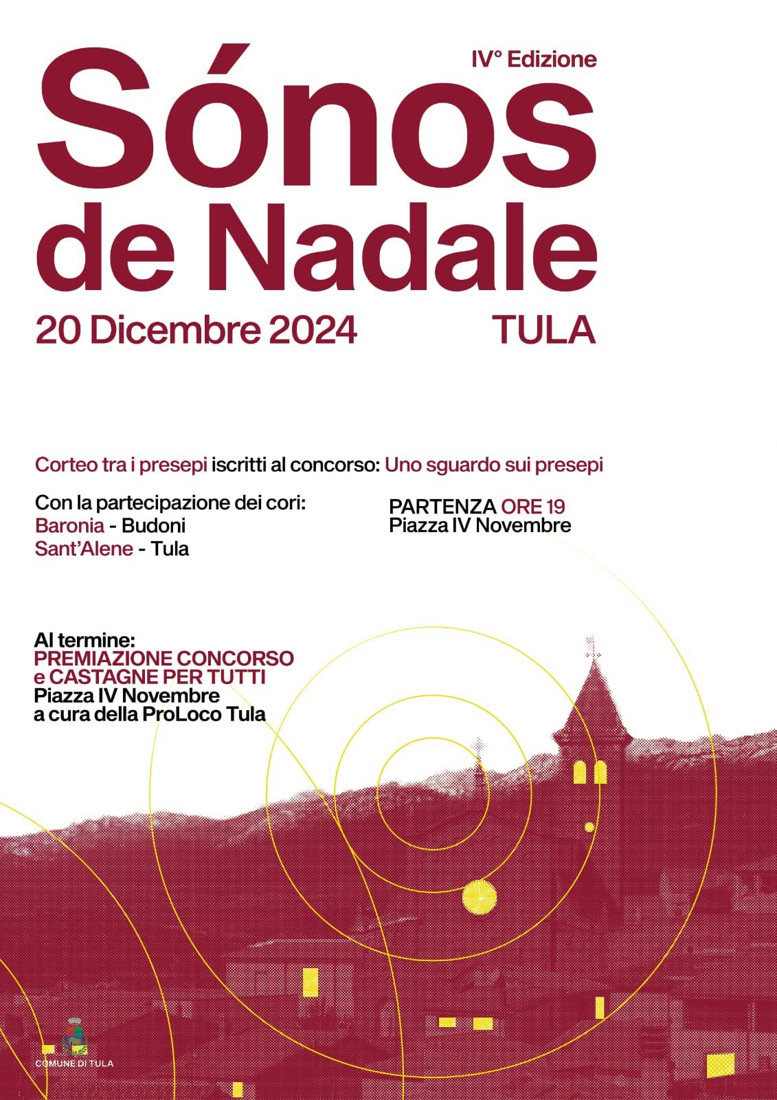 Avrà luogo venerdì 20 dicembre, dalle 19.00, la quarta edizione di “Sònos de Nadale”. Si partirà con il corteo tra i presepi iscritti al Concorso Uno sguardo sui presepi”, con partenza da Piazza IV Novembre con la partecipazione del Coro Baronia di Budoni e del Coro Sant’Alene di Tula.