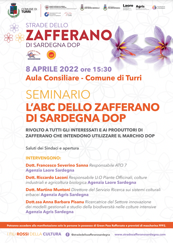 Venerdi 8 aprile, alle ore 15.30, nell’aula consiliare del comune di Turri, si terrà il convegno dal titolo l’ABC dello Zafferano di Sardegna DOP. L’evento, inserito all’interno della programmazione della Rassegna Le Strade dello Zafferano di Sardegna DOP, è organizzato dalla rete dei comuni di Turri, San Gavino Monreale e Villanovafranca, sostenuto da Fondazione di Sardegna ed assessorato della Cultura della Regione Sardegna, con il coordinamento organizzativo dell’Associazione Enti locali si propone come un utile e interessante momenti di confronto e formazione finalizzato a comunicare e a diffondere tra i soggetti interessati le buone pratiche ed i vantaggi della DOP.