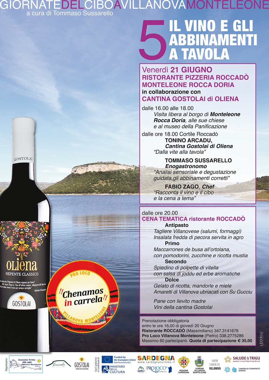 Si terrà venerdì 21 giugno, alle 16.00, al ristorante Pizzeria Roccadò di Monteleone Rocca Doria, “Vino e abbinamenti a tavola”, evento dalla Pro Loco di Villanova Monteleone in collaborazione con il Comune di Monteleone Rocca Doria e con la Cantina Gostolai di Oliena.