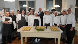 Inaspettata e molto gradita anche la visita di Massimo Apolloni, delegato dell’Accademia Italiana della Cucina a Stoccolma, che si è recato nelle cucine per complimentarsi con i ragazzi per il lavoro, a suo dire, straordinario, sia nella qualità dei piatti che nella loro presentazione. L’esperienza professionale è stata condivisa con alcuni studenti della International Hotel & Restaurant School (IHR) di Stoccolma che, con entusiasmo, hanno collaborato in cucina divertendosi a preparare le panadas e altri piatti tipici sardi insieme ai colleghi sassaresi.
