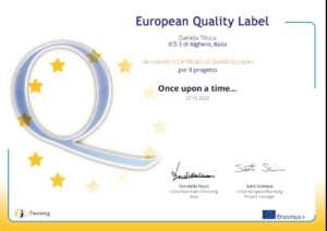 Importante riconoscimento per la scuola secondaria di I grado dell’Istituto comprensivo numero 3 di Alghero che ottiene la Certificato europeo di qualità per il progetto “Once upon a time” per la Scuola Secondaria di I grado dell’Istituto comprensivo numero 3 di Alghero che ottiene la certificazione di qualità nazionale e della European Quality Label per il progetto eTwinning, un percorso motivante e creativo per lo studio e la condivisione geo-storica di alcuni paesi europei.