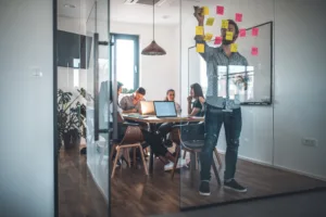 Male web designer sticking adhesive note while colleagues in background at office. Businessman is seen through glass wall. He is working at workplace.