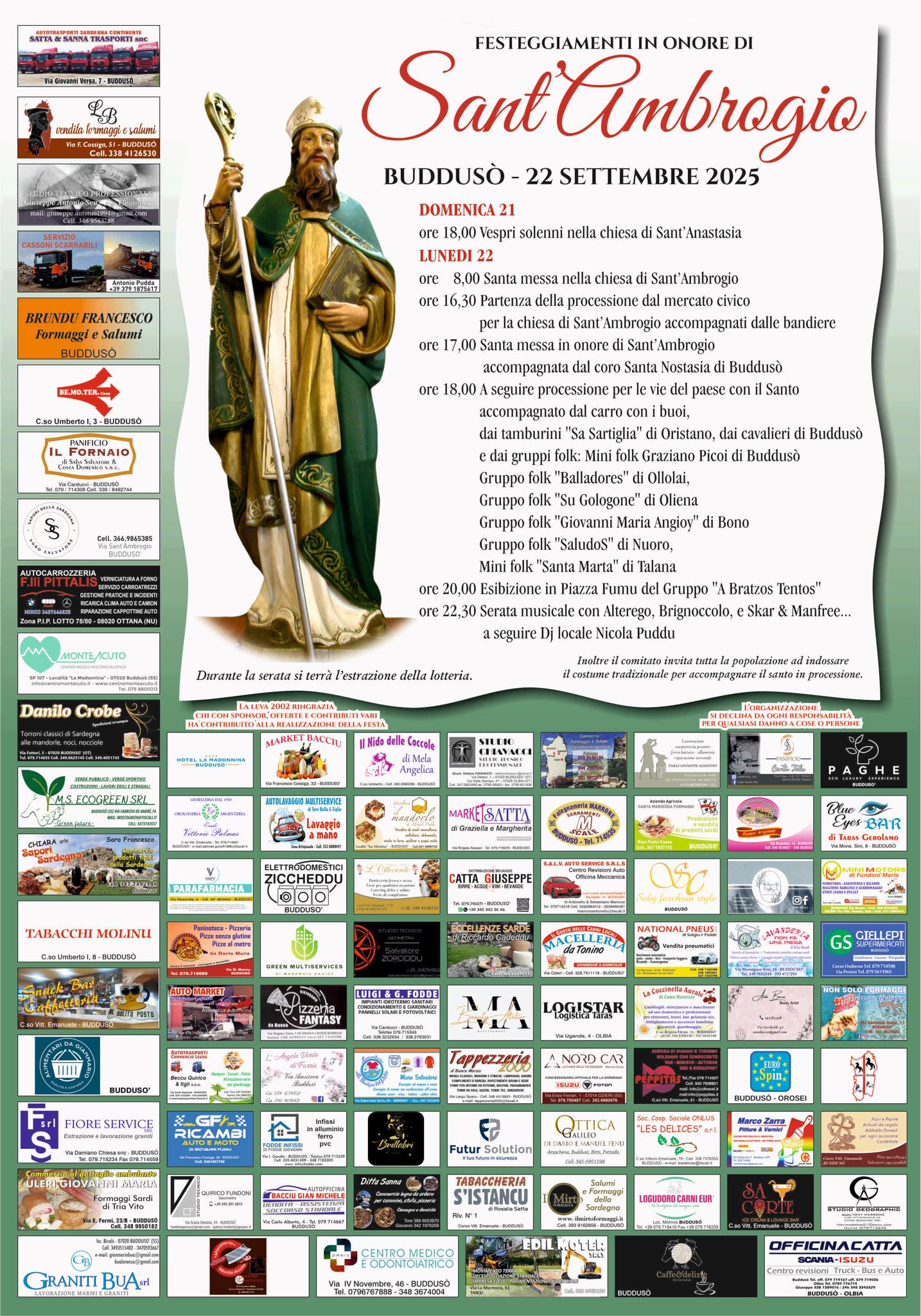 La leva 2002 di Buddusò ha ufficializzato il programma dei festeggiamenti in onore di Sant’Ambrogio. Il primo evento è in programma domenica 21 settembre, alle 21.00, con i Vespri solenni.